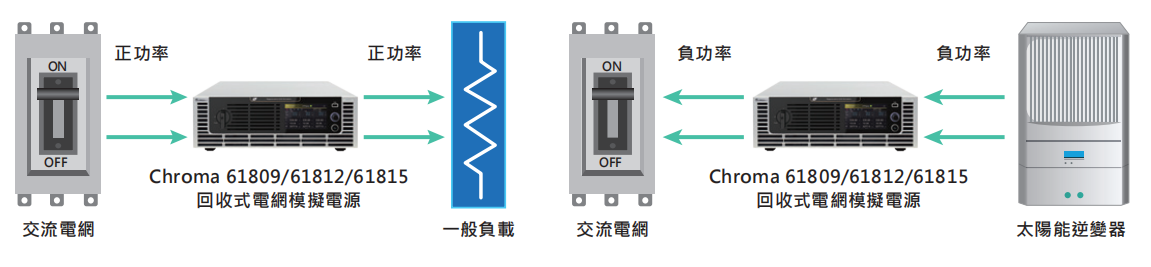 Chroma 61809/61812/61815机种具备能源回收功能,可提供使用者完善的节能方案。待测物在测试中所产生的能量,经由机器可高效率回馈到电网,而不是在测试过程以热能消耗,达成环保节能的目的。借此,61809/61812/61815可适用于市面上各项绿能相关产业测试,如太阳能逆变器、储能系统(ESS)、电力调节系统(PCS)、微电网(Micro grid)、电力相关硬件回路模拟(PHIL)、电动车电源设备(EVSE)、车载充电器(OBC)及双向车载充电器(BOBC)等等。