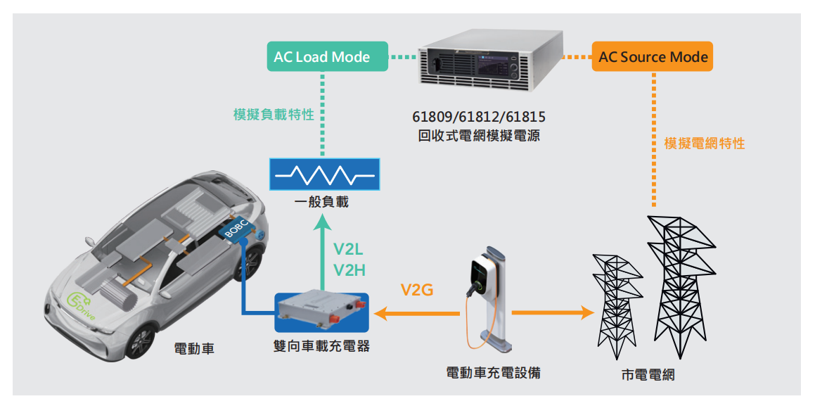 Chroma 61809/61812/61815机种可对电动汽车产业相关产品,如电动车充电设备EVSE(Electric Vehicle Supply Equipment)及车载充电器OBC(On Board Charger)等提供完善的电源测试解决方案,亦可完成EVSE测试规范SAE J1772(AC Level 1,AC Level 2)、OBC中国QC/T 895标准等法规测试。此外,OBC的发展趋势正朝着双向充放电应用如V2G(Vehicle to Grid)、V2L(Vehicle to Load)及V2H(Vehicle to Home)等技术做发展,而61809/61812/61815具备能源回收功能、AC Load选配功能、PLD进阶编辑功能,可满足此双向车载充电器BOBC(Bi-directional OBC)相关的各项测试应用需求。