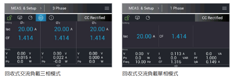 Chroma 61809/61812/61815机种可选配B618007:回收式交流负载功能,实现单一机体拥有交流电源和交流负载双功能,使用者可透过简易的UI操作快速切换Source或Load模式。当机器为交流负载模式时,不仅具备能源回收功能,可进行四象限拉载,且单机可选择单相或三相操作模式,此外也支持最多三台单机并联功能,提供最高45kW的交流负载测试方案。