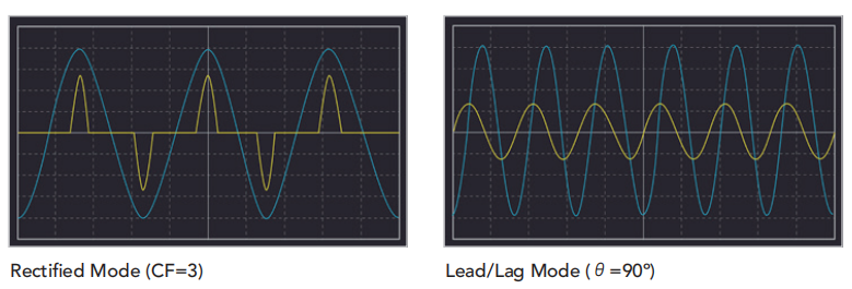 Chroma 61809/61812/61815回收式交流负载,于CC Rectified Mode提供半波拉载功能。在电压、电流为正弦波条件下,可提供正半周、负半周拉载,以及模拟SCR/TRIAC开关特性的90度Leading Edge、Trailing edge半波拉载。使用者可藉由拉载半波电流,模拟调温/调光的家用电器、保护开关、感应马达等相关待测物的负载特性,测试电压源的输出稳定度。