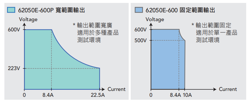 62000E系列具有两款电源-宽范围(Auto-range Output)电源及固定范围(Fixed-range Output)电源,可供使用者依应用、规格及预算进行选购。例如,62050E-600P为宽范围电源设计,输出规格为5kW/600V/22.5A,可于不同的组合中灵活操作(如图所示),于低输出电压223V时提供较大的电流22.5A,反之于高压600V时提供较小的电流8.4A,这表示低电压/高电流及高电压/低电流两者需涵盖的待测物可选择宽范围直流电源供应器,适合使用于Test & Measurement的自动测试系统(ATE),以取代多台直流电源供应器,节省成本与空间。