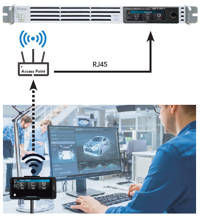 当电源因空间问题被放置于实验桌台架上或旁边柜体内时,此时将不方便工程师于实验桌前快速进行手动操作电源及On-line调整输出至待测物并监控,此时透过远端镜面投射功能将行动装置变身摇控键盘(Remote control keypad)方便工程师使用。考察远端控制安全性,使用者需输入密码开启。