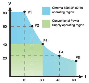 62000P系列直流电源供应器提供宽广的操作范围。例如,62012P-80-60的输出规格为 1200W/80V/60A可于不同的组合中灵活操作如图右侧所示。如普通的直流电源电源供应器显示提供所有的输出电压相同的额定电流,而62000P于低输出电压时提供较大的电流。这表示低电压/高电流及高电压/低电流两者的待测物可使用单台直流电源供应器测试输入稳定度,于一般的ATE系统内部避免多台直流电源供应器以节省成本与空间。