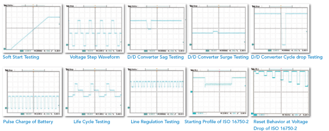 62000P系列电源供应器另一个独特的功能为可建立复杂的DC暂态波形。此功能可对设备进行输入电压漏失瞬断和其他电压变化等测试,是用于飞机设备测试、反用换流器测试和其他会产生电压中断之设备测试的理想选择。其应用的范围包括DC/DC 转换器和反用换流器、压降测试、引擎启动模拟、电池自动充电、电子产品生命周期测试等等。