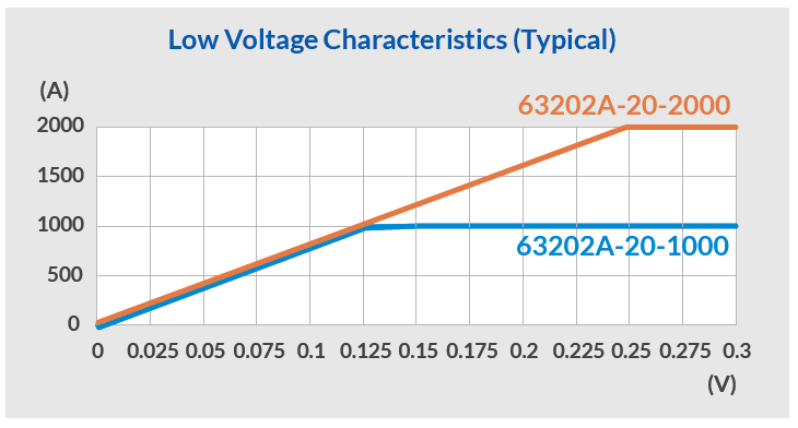 低压大电流电子负载,具有卓越的低电压特性,特别是63202A-20-2000型号,其负载端最小操作电压可达0.25V,在此电压下提供高达2,000A的最大额定电流。需特别注意若受线材压降影响,导致负载端低于0.25V,则无法提供2,000A之电流。此外,即使在电压低于0.25V至0V区间内,该设备仍能拉载电流,展现出稳定的性能,可参考低电压操作特性V-I曲线图*。