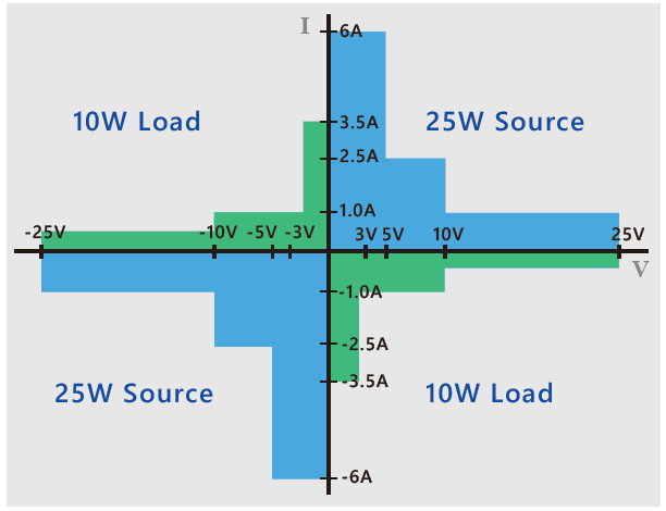 Chroma 52403P短脉冲电源量测单元包含2个主要模组:高速脉冲产生器(Pulser)模组和SMU模组,高速脉冲产生器(Pulser)在第1象限输出操作;SMU模组为4象限输出操作,可供应电压/电流源(I/III 象限)或模拟负载(II/IV 象限),如图6示意。