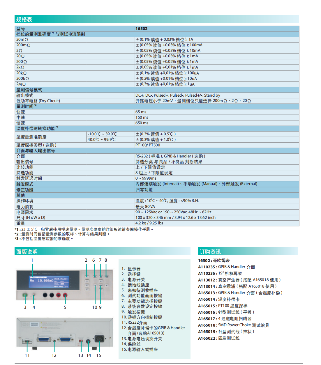 Model 16502是数位式毫欧姆表,具有0.05%基本准确度,并提供0.001mΩ~1.9999MΩ的量测范围,量测时间最快可达65ms,应用于自动化生产、品管进出料品检验及提供研发单位使用。